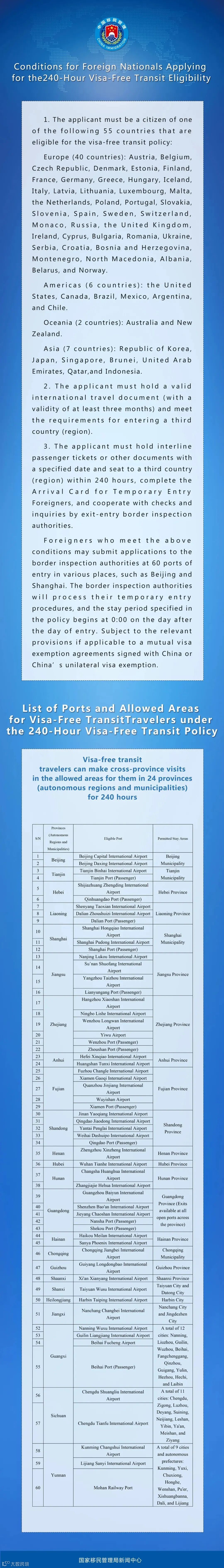 目前,印度尼西亚、俄罗斯、英国等55国人员持有效国际旅行证件和确定日期及座位的联程客票,从中国过境前往第三国或地区,可从北京、上海等24个省(区、市)60个开放口岸中的任一口岸免签入境,并在规定区域停留活动不超过10天。停留期间可从事旅游、商务、访问、探亲等活动,工作、学习、新闻采访等需事先批准的活动仍应办妥签证。