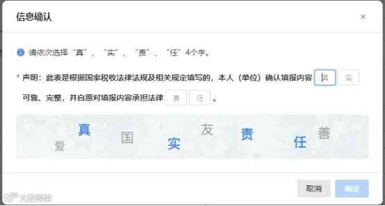 (6)申报数据确认无误,点击“提交”后,在输入框依次点击“真”“实”“责”“任”4个字,点击“确定”提交申报。