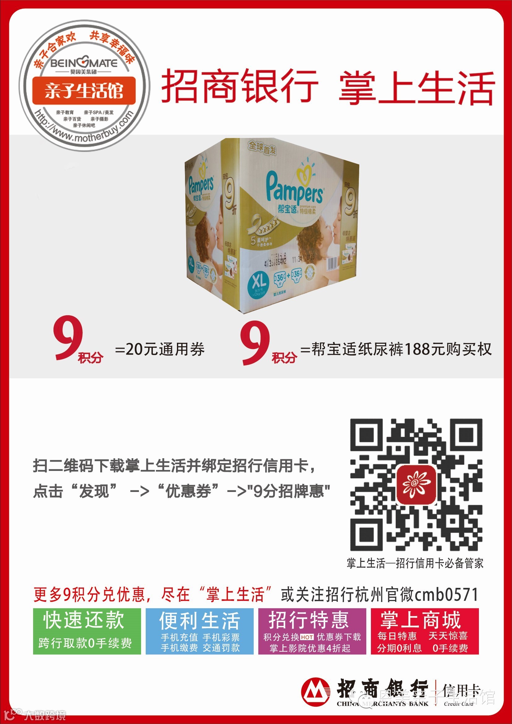 活动一:招行9积分可免费兑换20元现金券+帮宝适指定系列35元抵价券