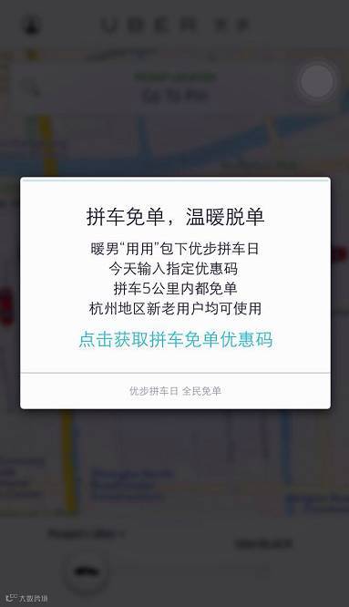 今天,只要你在杭州使用优步的拼车服务, 输入优惠码“用用包场优步拼车日”,就能获得一次免费乘车机会。