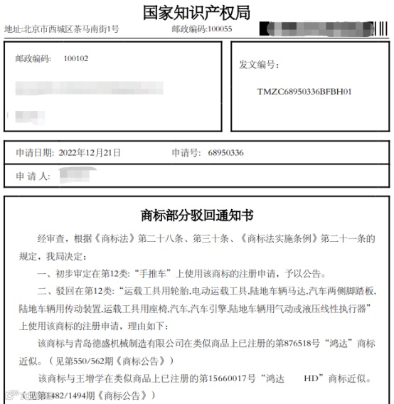◆驳回理由:“辛鸿达”,在指定商品上被引证“鸿达”驳回!