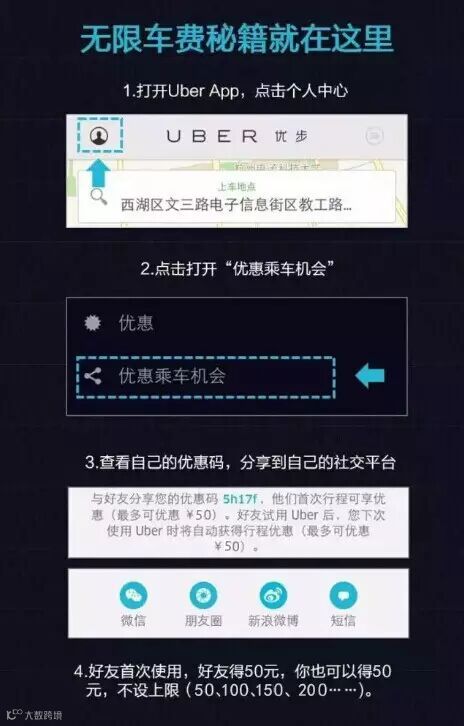 感谢热心微信好友们向平台提供的优步优惠码,让大家感受无限优步的酷爽(嘘~),话不多说,一起来看吧!!(长按下方红色字母数字,任选其一,复制到优步优惠内,现更新首次乘车优惠30元)好友试用优步后,微友将自动获得行程优惠。