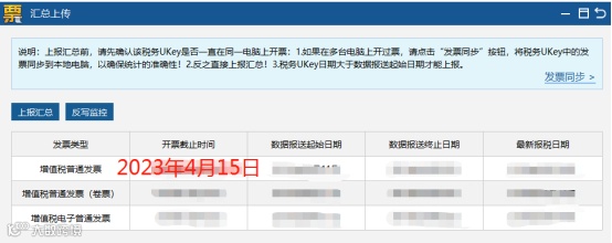 操作流程:重新打开汇总上传界面,查看各发票类型开票截止时间是否更新到下月中旬(4月15日左右),若更新,说明操作成功。