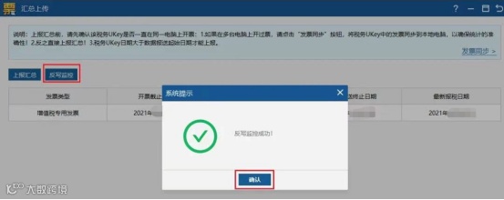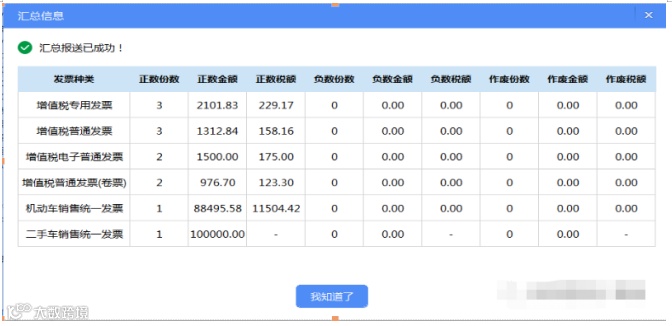 开票软件电脑联网稳定且软件中服务器地址和端口号正确的情况下,一般在征期范围内15号之前初次进入开票系统,开票软件会自动上报汇总。如果系统提示“汇总报送已成功!”点击“确认”,说明抄税成功,如下图所示: