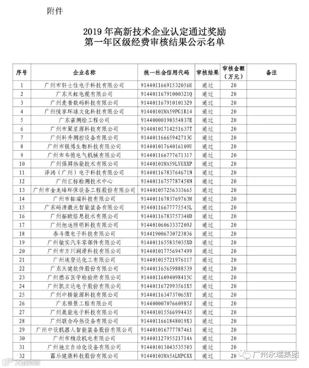 根据《广州市科技创新委员会关于印发广州市高新技术企业树标提质行动方案(2018—2020年)的通知》(穗科创规字〔2018〕1号)、《广州市黄埔区、广州开发区、广州高新区进一步促进高新技术产业发展办法》(穗埔府规〔2020〕4号)的规定,现对2019年高新技术企业认定通过奖励第一年区级经费审核结果予以公示(见附件)。