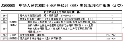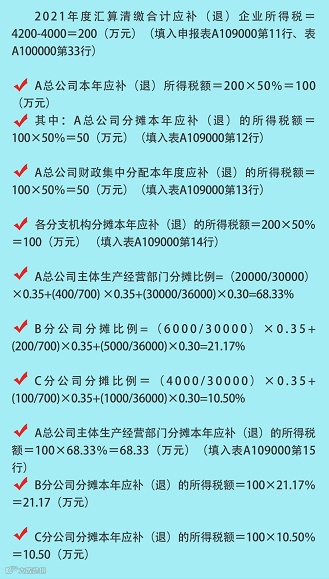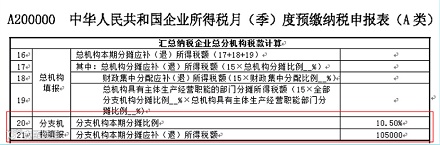 2021年度企业所得税汇算清缴时,A总公司汇总计算的实际应纳所得税额为4200万元(表A100000第31行) 。2021年A总分公司本年累计实际已预缴的所得税额为4000万元。