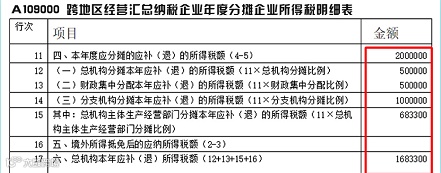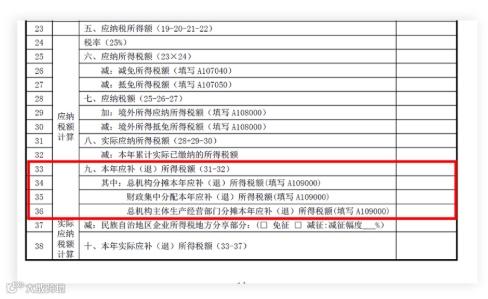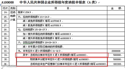 《A100000中华人民共和国企业所得税年度纳税申报表(A类)》汇总计算总分机构申报数据,填写第33、34、35、36行数据(其中34、35、 36行数据从A109000表带到主表)