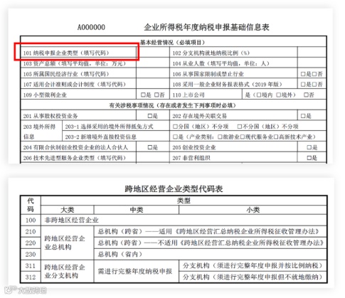 《A000000企业所得税年度纳税申报基础信息表》‘'101纳税申报企业类型(填写代码)" (根据代码表填写)