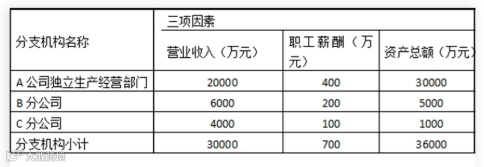 2020年度A总公司以及A总公司具有主体生产经营职能的部门(以下简称A总公司主体生产经营部门)、B分公司、C分公司的营业收入、职工薪酬、资产总额如下: