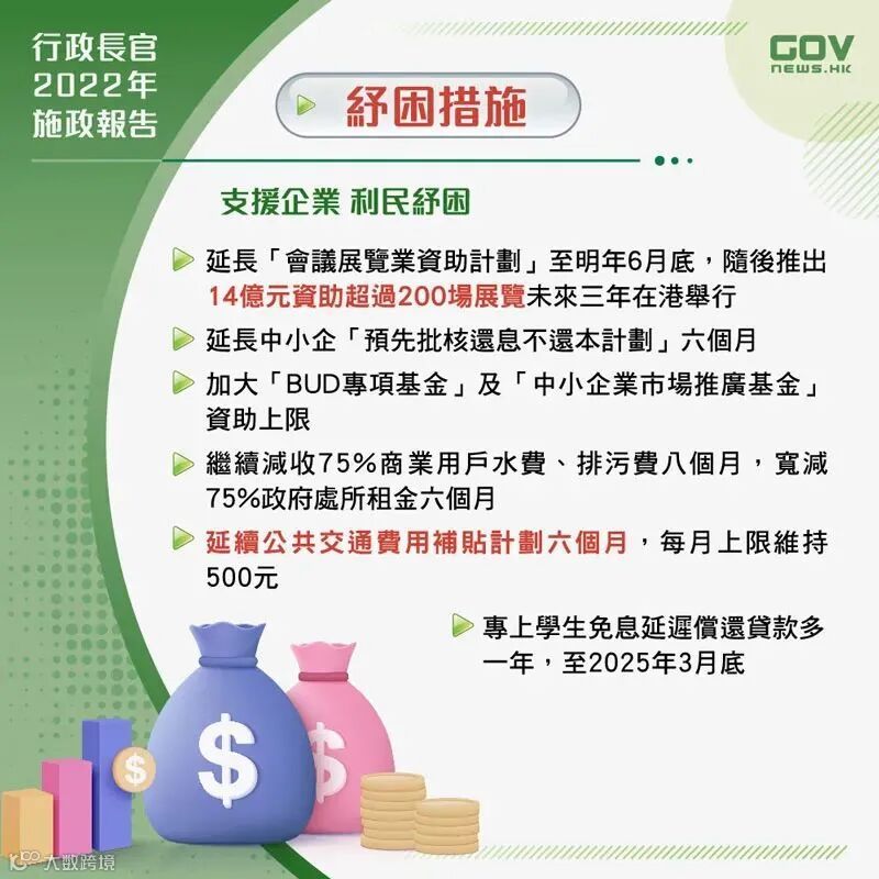 🌟 再延长中小企「预先批核还息不还本计划」六个月,继续减收商业用户水费、排污费八个月,并继续宽减政府处所和短期租约租金或费用六个月