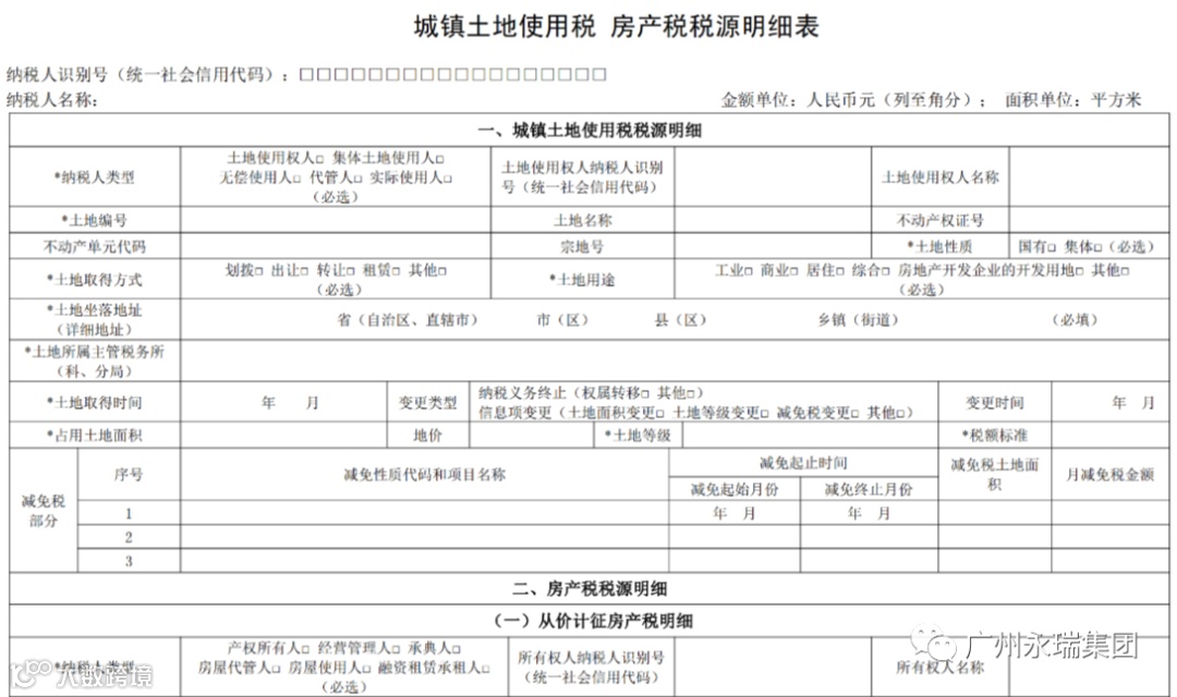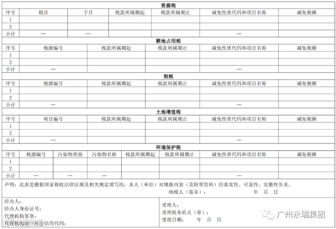 自2021年6月1日起,纳税人申报缴纳城镇土地使用税、房产税、车船税、印花税、耕地占用税、资源税、土地增值税、契税、环境保护税、烟叶税中一个或多个税种时,使用《财产和行为税纳税申报表》(附件1)。纳税人新增税源或税源变化时,需先填报《财产和行为税税源明细表》(附件2)。