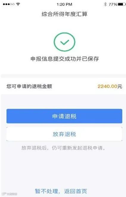 如果银行卡不在身边,或者暂时不想退税,可以点击【暂不处理,返回首页】。后续可再次发起退税申请。