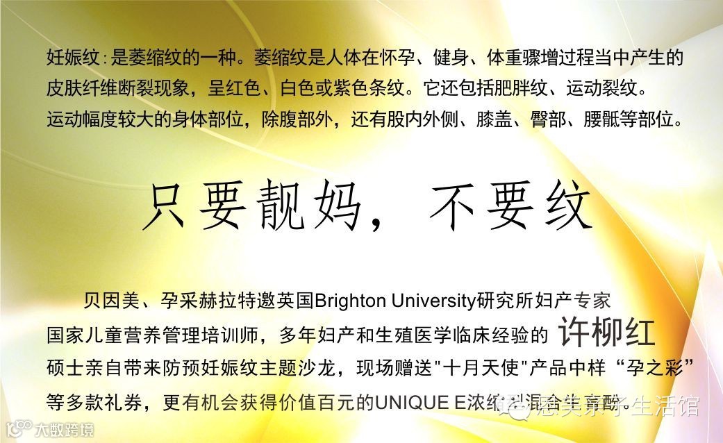 贝因美、孕采赫拉特邀英国Brighton University研究所妇产专家国家儿童营养管理培训师,多年妇产和生殖医学临床经验的许枊红硕士亲自带来防预妊娠纹主题沙龙,现场赠送"十月天使"产品中样“孕之彩”等多款礼券,更有机会获得价值百元的UNIQUE.E浓缩型混合生育酚。