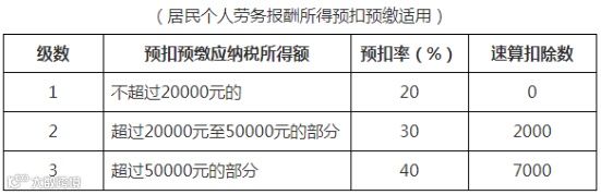 减除费用:预扣预缴税款时,劳务报酬所得、稿酬所得、特许权使用费所得每次收入不超过四千元的,减除费用按八百元计算;每次收入四千元以上的,减除费用按收入的百分之二十计算。
