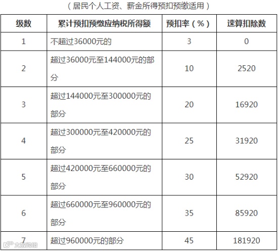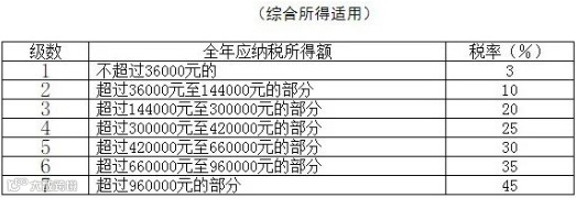 综合所得是指居民个人取得的工资、薪金所得;劳务报酬所得;稿酬所得和特许权使用费所得,适用百分之三至百分之四十五的超额累进税率(预扣率表见前述一、二)。