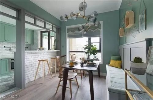 具有设计感的厨房和开放式的餐厅,整体依然是现代风格设计,大面积薄荷绿装饰的空间不会让人感觉沉闷,设计感时尚看起来也特别温暖。厨房和餐厅之间利用纹理感很好的Salenma萨拉玛艺术涂料涂刷墙面,涂刷效果完美的呈现出幸福温馨的感觉。