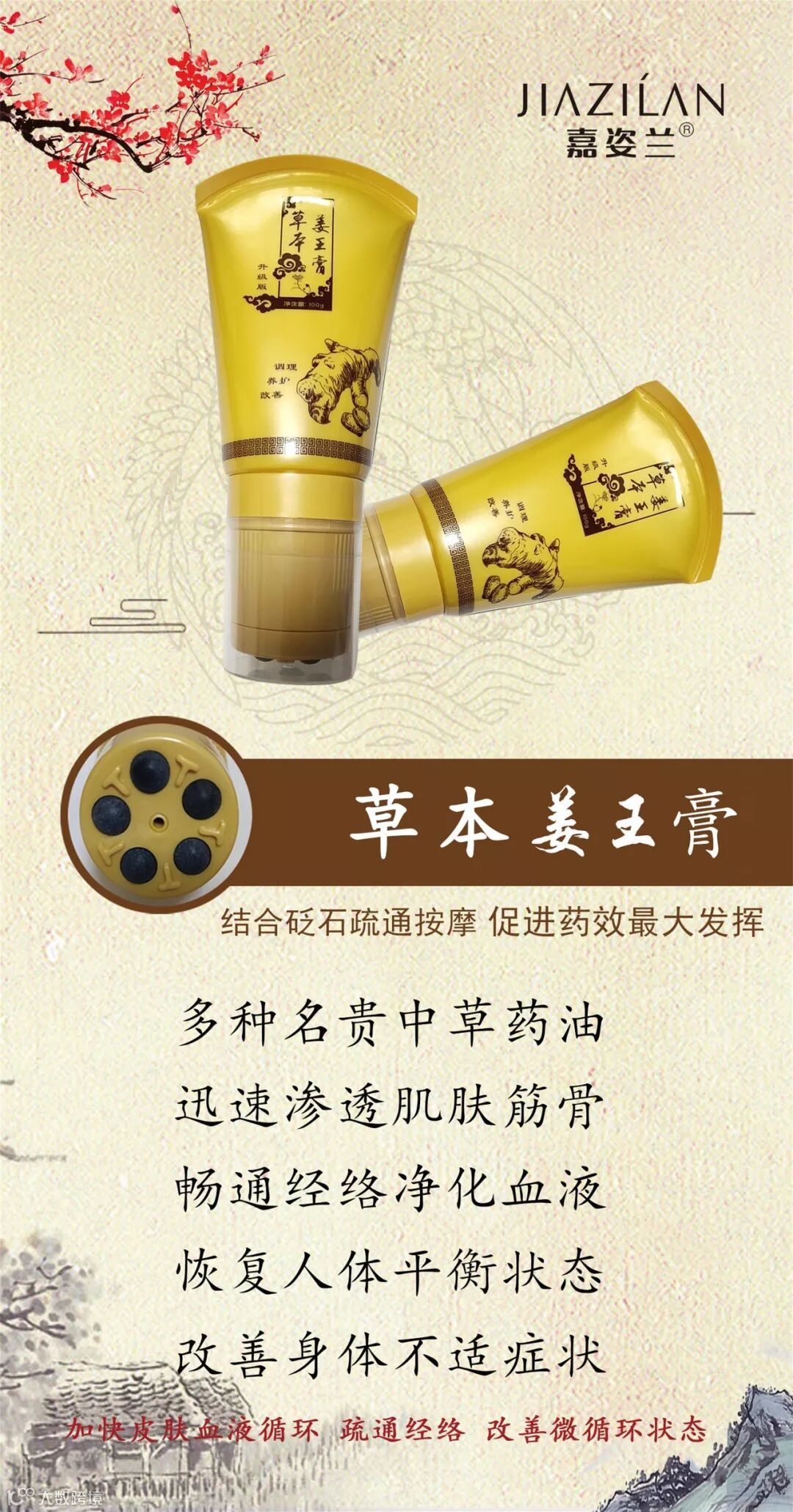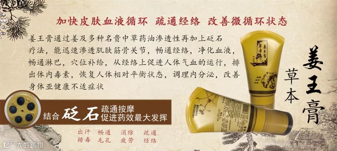 姜王膏通过姜及多种名贵中草药油渗透性再加上砭石疗法,能迅速渗透肌肤筋骨关节,畅通经络,净化血液,畅通淋巴,穴位补给,从经络上促进人体气血的运行,排出体内毒素,恢复人体相对平衡状态,调理内分泌,改善身体亚健康不适症状。