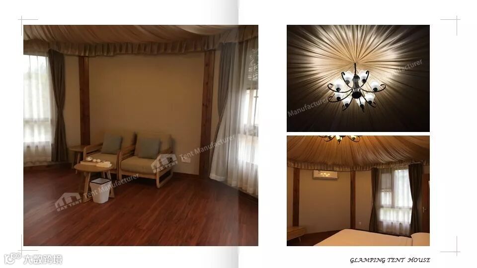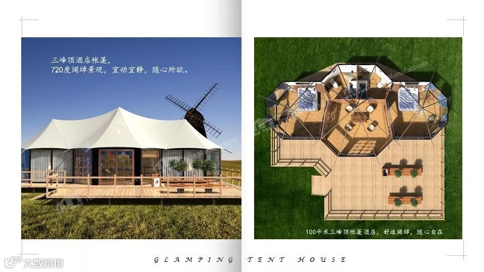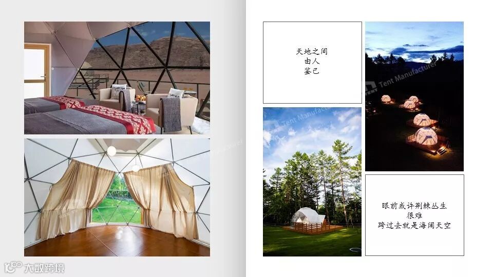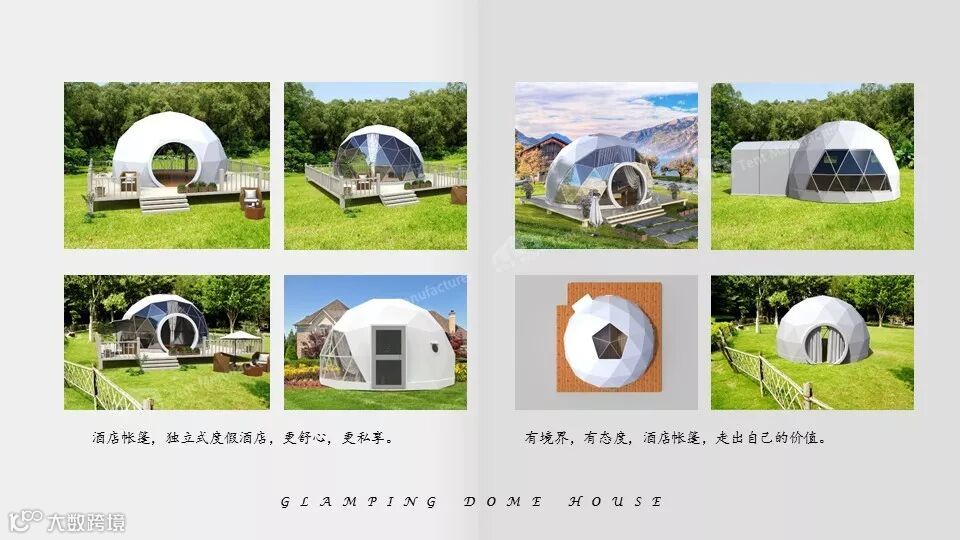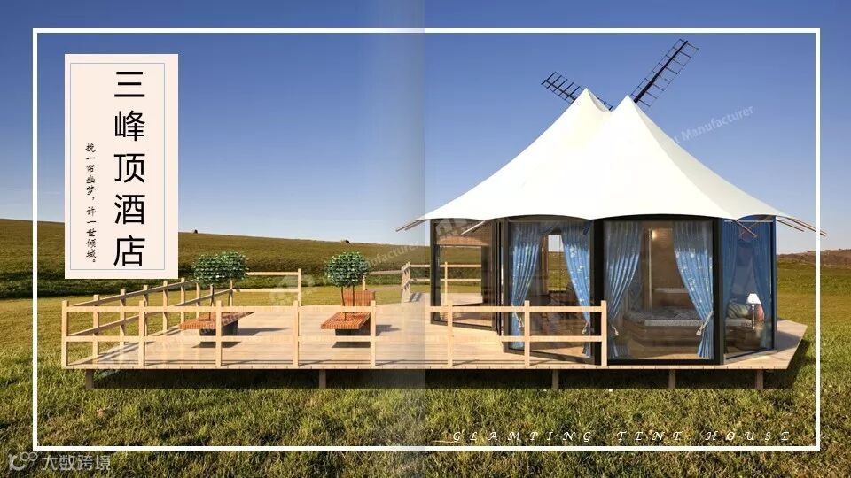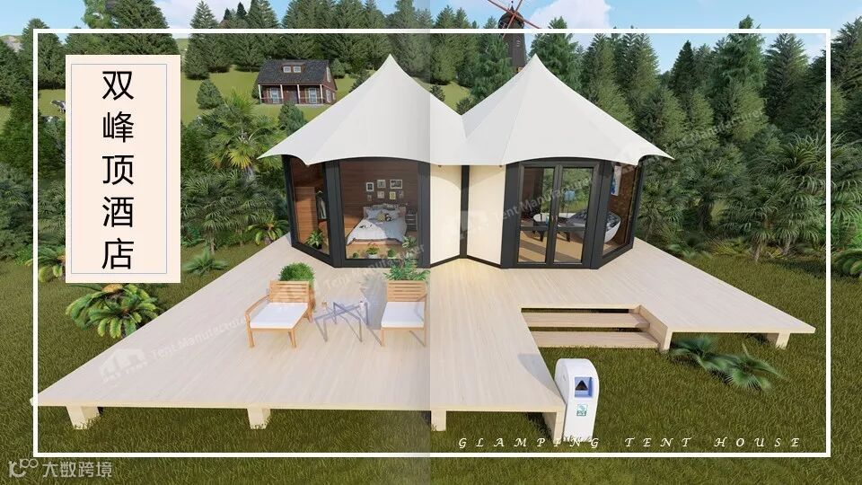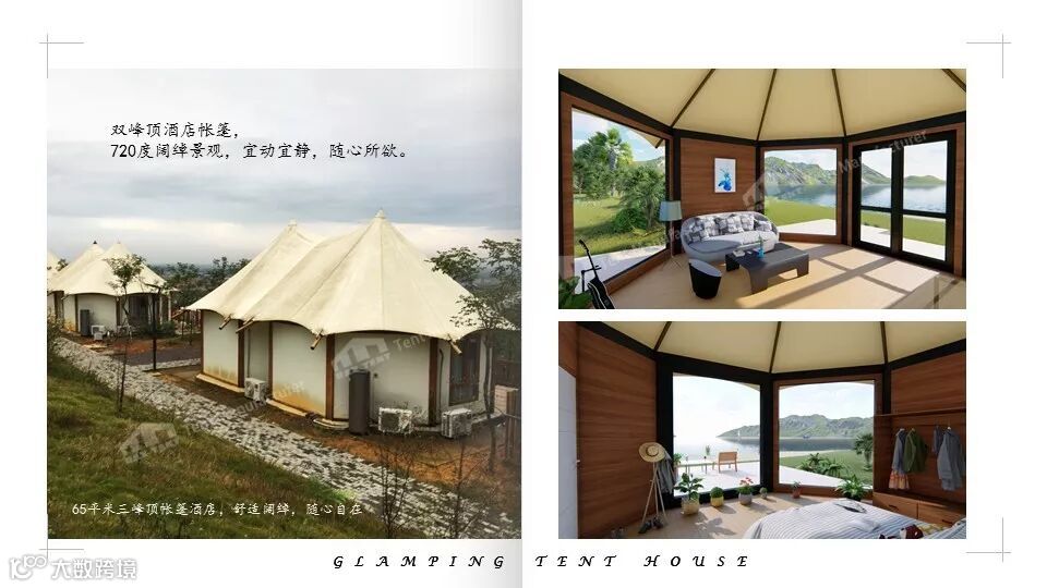 酒店帐篷在国内外市场使用都非常普遍,常适用于旅游景区、风景区、高尔夫球场,赛事场地等,主要承担了酒店住宿的功能。因此,考虑到入住人群的区域特征及兴趣爱好特征及周边自然环境的条件,在进行酒店帐篷设计时没有完全统一的标准,而是根据终端客户的差异性而不同。