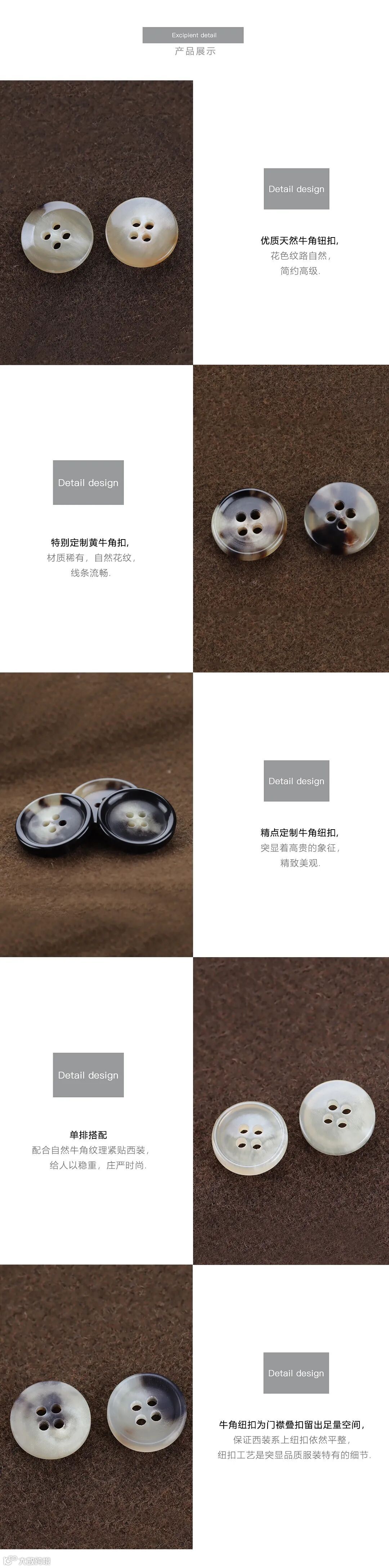 原材料采用优质天然水牛角,牛角扣具有耐磨、抗压、不易褪色等优良特点,对服装都起到锦上添花的点缀作用,在服装定制中广受欢迎。