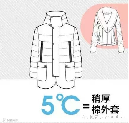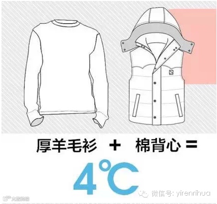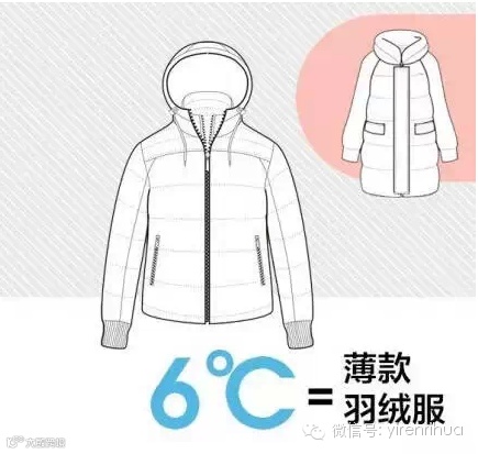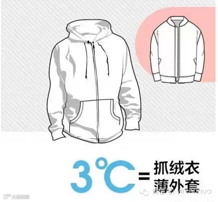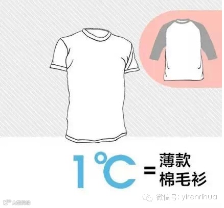 根据医师的测量,每件衣服能增加的温度:厚羽绒服9℃,薄款羽绒服6℃,稍厚弹力絮棉衣5℃,厚羊毛衫4℃,棉背心4℃,抓绒衣服3℃,薄外套3℃,厚棉毛衫2℃,薄棉毛衫是1℃。