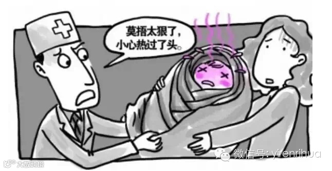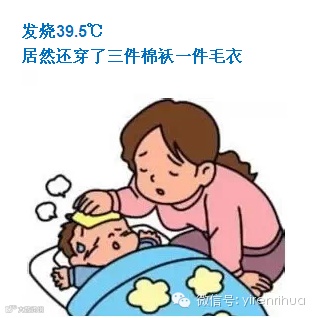 男婴儿,6个月大,发烧39.5℃。上身穿厚棉内衣+毛线衫+棉背心+丝棉袄,下身是厚棉长裤+毛裤,全身又套了一件弹力絮连体棉袄。孩子精神不大好,趴在奶奶背上一动不动。医师摸摸孩子后背,全是汗,便赶紧让奶奶把孩子的丝棉袄脱掉和弹力絮连体棉袄脱掉,散散热。
