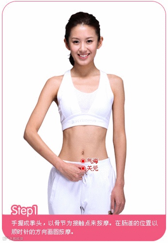 第一步:手握成拳头,以骨节为接触点来按摩。在肠道的位置以顺时针的方向画圆按摩。