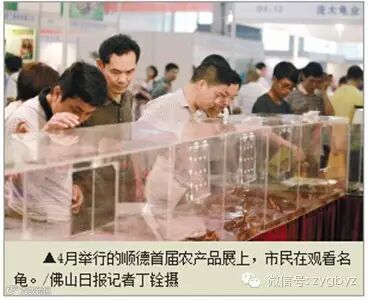 上月中旬,顺德首届农产品展在顺德展览中心举行,顺德及周边地区的数十家大型龟鳖养殖场,带着平日难得一见的各类名龟前来参展,不少市民拿出手机、相机猛拍,并分享到朋友圈。