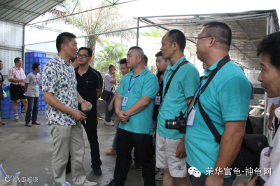协会成员除了参观养殖场之外,还跟各个养殖场的负责人交流养殖场的养殖模式及运营模式。如在陈村金顺龟鳖合作社参观时,有协会成员就问及协会与合作社不同之处。陈村金顺龟鳖合作社黄社长介绍,合作社是一个以农户为中心,集中投资,共同养殖,政府出资扶助的社团单位,合作社收益与养殖户挂钩,具有法律约束效力。协会是一群爱龟人士为了使该地区的养殖户能集中起来而组织的社团,法律约束效力不强。在花之星名龟交流中心参观时,协会会员发现养殖场里面放着一袋袋水质过滤材料,询问下才得知这些过滤材料是用来过滤养殖场的水质,使养殖龟的水体得以循环利用,节约资源。负责人还介绍养殖了养殖种龟要记录每只种龟的情况并适当配种,这样会有助于提高产蛋量。在最后一站的均安威霖龟鳖养殖场,会员们了解了大范围园区养殖名龟要注意养殖的平衡性,不能单一地为养龟而养龟,而要通过调节环境,使龟生活得更舒适,如遮光、绿化、场地铺设等设施。