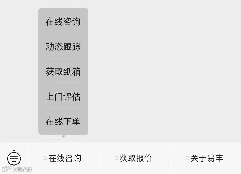 ①关注【易丰搬家】微信公众号,点击菜单栏【在线咨询】,选择【获取纸箱】,即可直达获取纸箱页面。