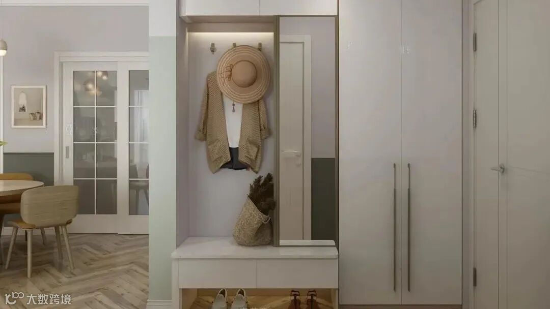 若玄关做了顶天立地式的柜子,可以直接利用柜子的悬挂区作为换鞋区就座。这种既可以固定不移动,卫生死角也会减少,还省去了购买换鞋凳的钱。