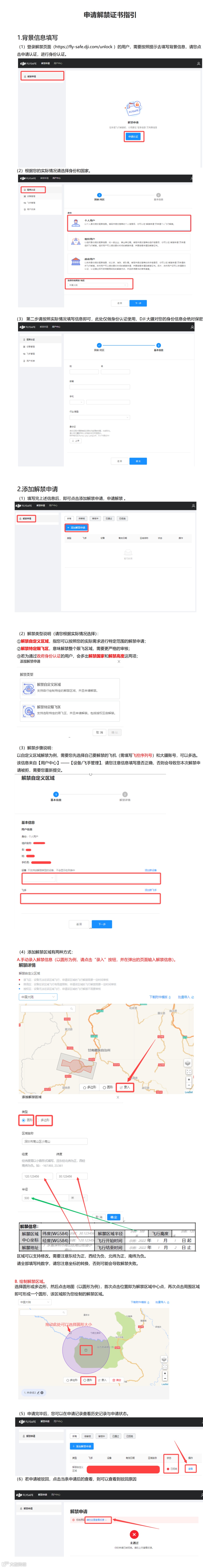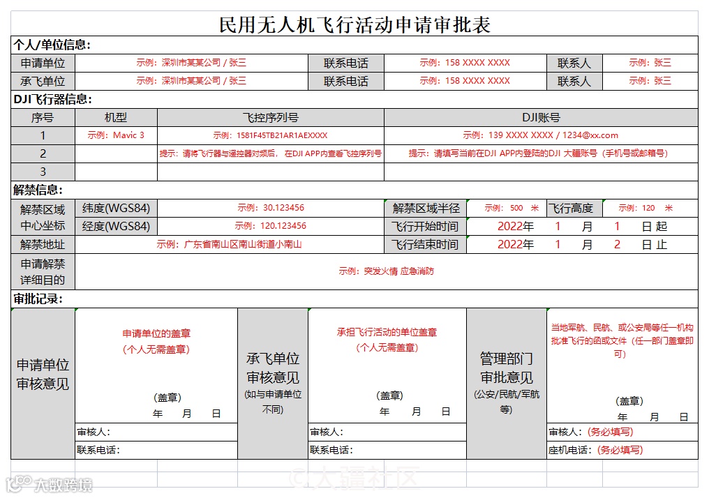 6. 官方有效批文/解禁申请表:解禁申请表需要有管理部门(公安/军航/民航,任意其一即可)盖章才有效的哈,参考如下图示填写并到对应管理部门加盖公章