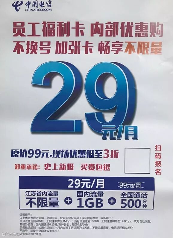 电信无限流量电话卡 29元每月永久无限流量500分钟全国电话。