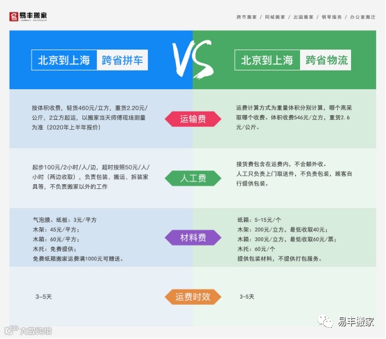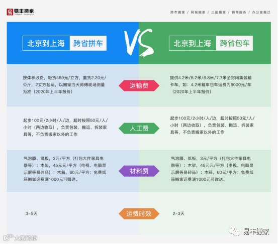 包装材料这块,易丰搬家按照平方计费,物流公司按照立方收取费用,值得一提的是,易丰搬家跨省拼车服务有两个亮点: