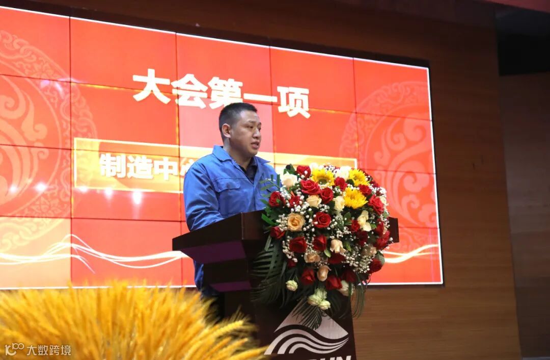(从左往右依次为:制造中心作工作报告、销售中心南西区作工作报告、技术中心作工作报告、行政中心作工作报告、先进集体代表发言、部门经理代表发言、员工代表发言)