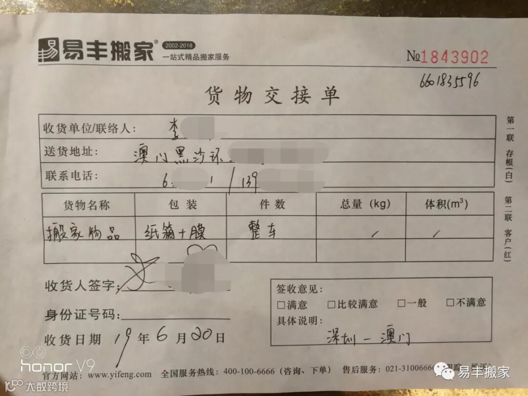 6.20日,从早晨的8点钟到下午的17点钟,9个小时的搬家旅程,在客服完成回访之后落下帷幕,李先生对易丰搬家服务的肯定,也让此次深圳到澳门的长途搬家之旅划下了圆满的句号。
