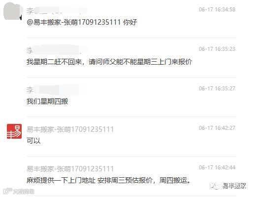 6.17日下午,李先生再次找到了他的专属客服,预定了上门估价时间并确定搬家时间。