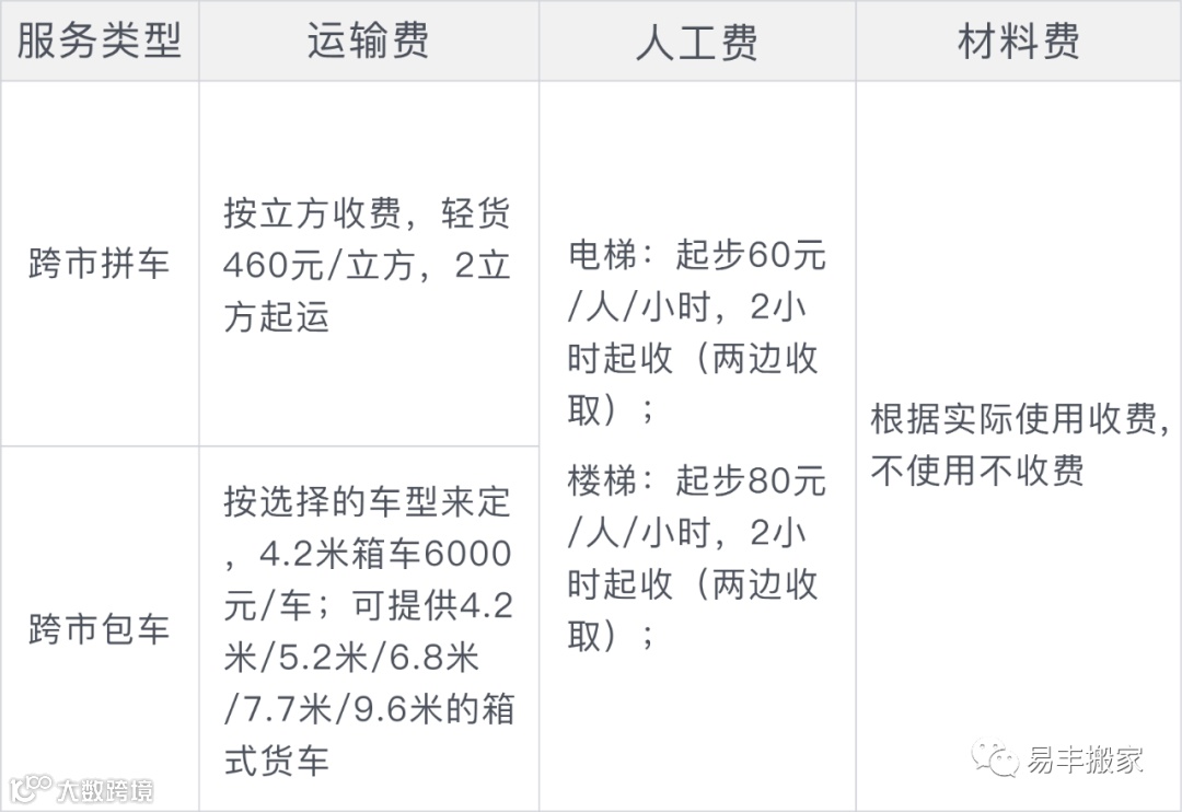 相对于市面上眼花缭乱的收费方式,易丰搬家跨市搬家收费 = 运输费+人工费+材料费,收费方式更加清晰明了,并根据顾客需求推出跨市包车和跨市拼车两种服务,具体收费明细如下: