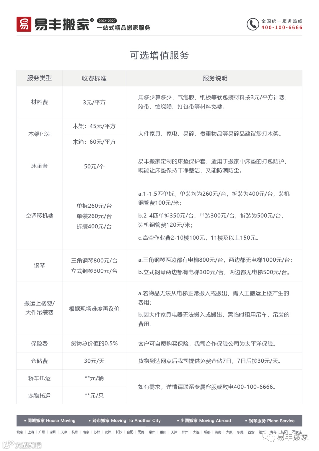 对于材料费、木架包装、床垫套、空调移机等可选增值服务,易丰搬家也进行了详细的说明,具体如下图: