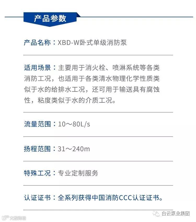 XBD-W卧式单级消防泵是根据消防系统用泵的特点,全面贯彻GB6245-2006《消防泵》标准设计的新一代消防泵,该系列产品经公安部消防装备质量监督检测中心检测合格,获消防CCC产品认可证书。