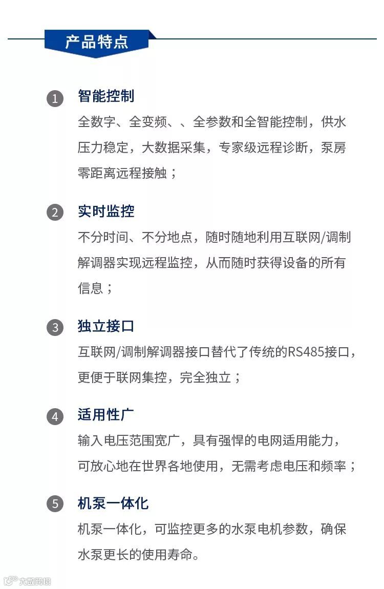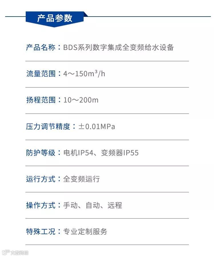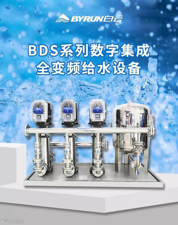 BDS系列数字集成全变频给水设备中的每台水泵均独立配置数字集成水泵专用变频控制器,各变频控制器通过CAN总线技术或MODBUS通讯技术相互通信、联动控制、协调工作,可直接通过显示屏进行人机对话,实现泵组运行参数的设定与调整,使泵组实现等量同步、效率均衡和全变频控制运行的成套变频给水设备,数字集成全变频给水设备实现了全数字、全变频、、全参数和全智能控制,是新一代品质更好、性能更强、可靠性更高、能耗更低的变频给水设备。
