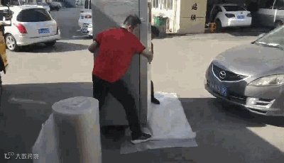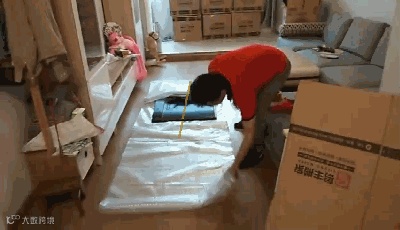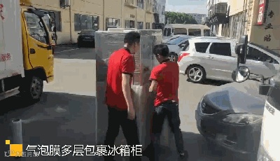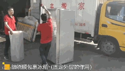 首先,二个师傅合作,将大大的冰箱搬到多层气泡膜上,并用密封胶带固定冰箱底部。
