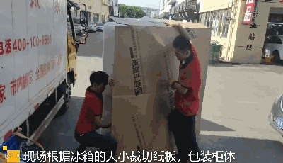 一般情况下,搬友很少会留下冰箱的原始包装的,所以,在搬家之前,师傅们会给我们的冰箱重新用纸板包裹好,穿上一件“新衣服”。
