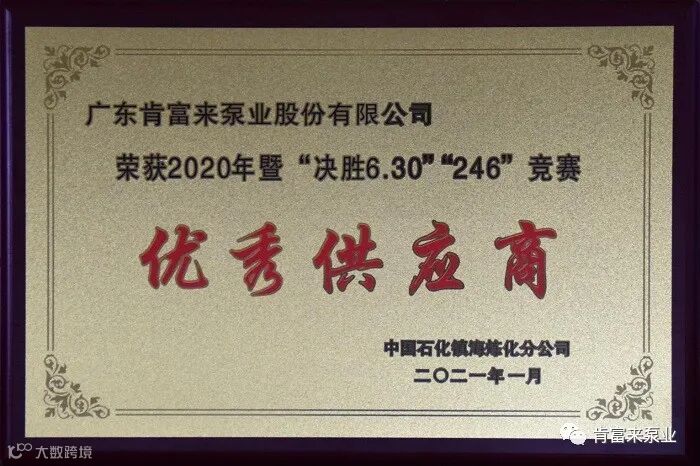 2021年2月1日,镇海炼化组织召开了“年度物资工作会暨供应商表彰会”。会上,镇海炼化授予肯富来“2020年度优秀供应商”荣誉牌匾,并希望肯富来再接再厉,做好后续的设备供货工作。