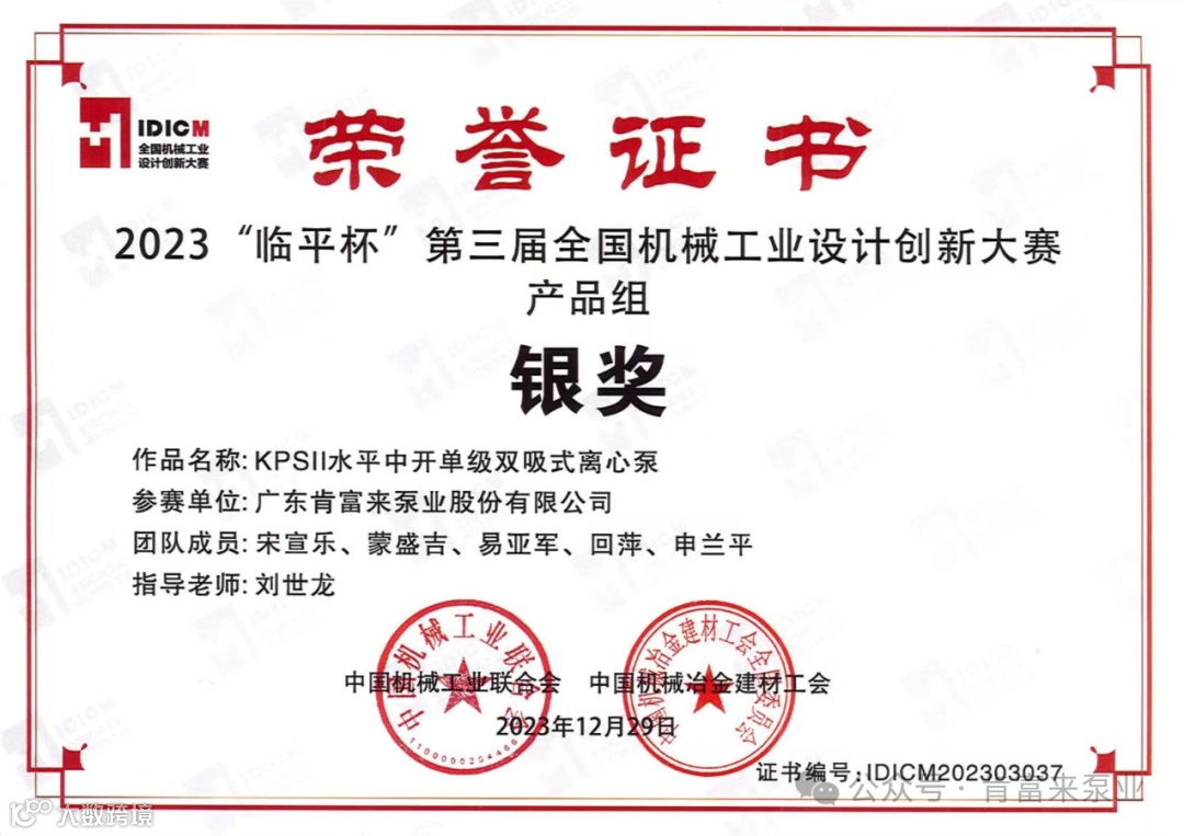 热烈祝贺广东肯富来泵业股份有限公司KPSII水平中开单级双吸式离心泵荣获2023临平杯第三届全国机械工业设计创新大赛“银奖”!