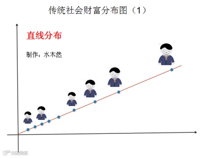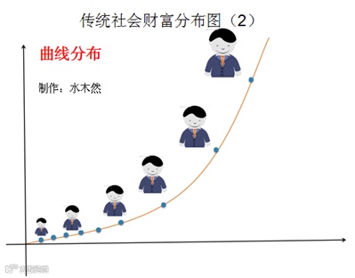 于是社会上形成了大量的“雇佣关系”,这使财富规律不再遵循线性增长规律,此时财富的分布而是变的更加陡峭,如下图: