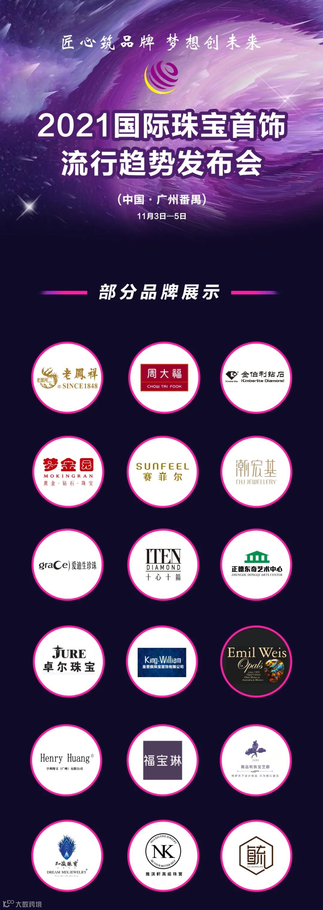 “2021国际珠宝首饰流行趋势发布会(中国·广州番禺)”将于11月3日—5日在广州市番禺区启幕,灿烂的灯光,绚丽的舞台,将为您打造一场难忘的珠宝盛会。