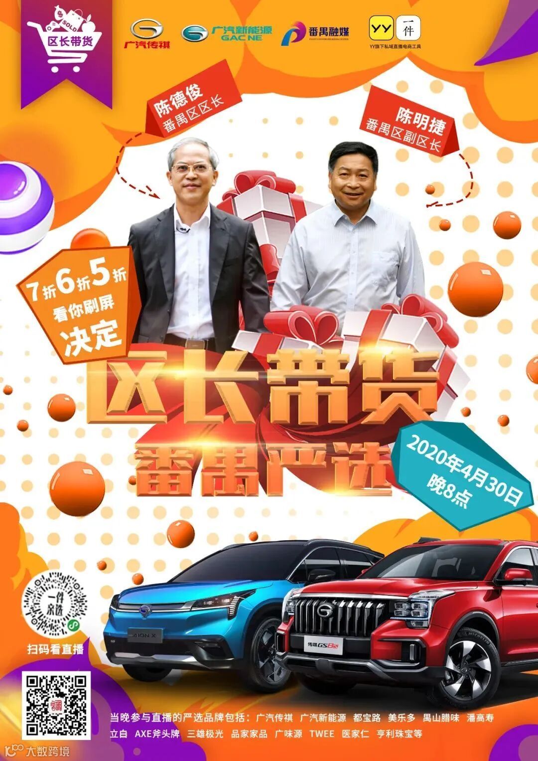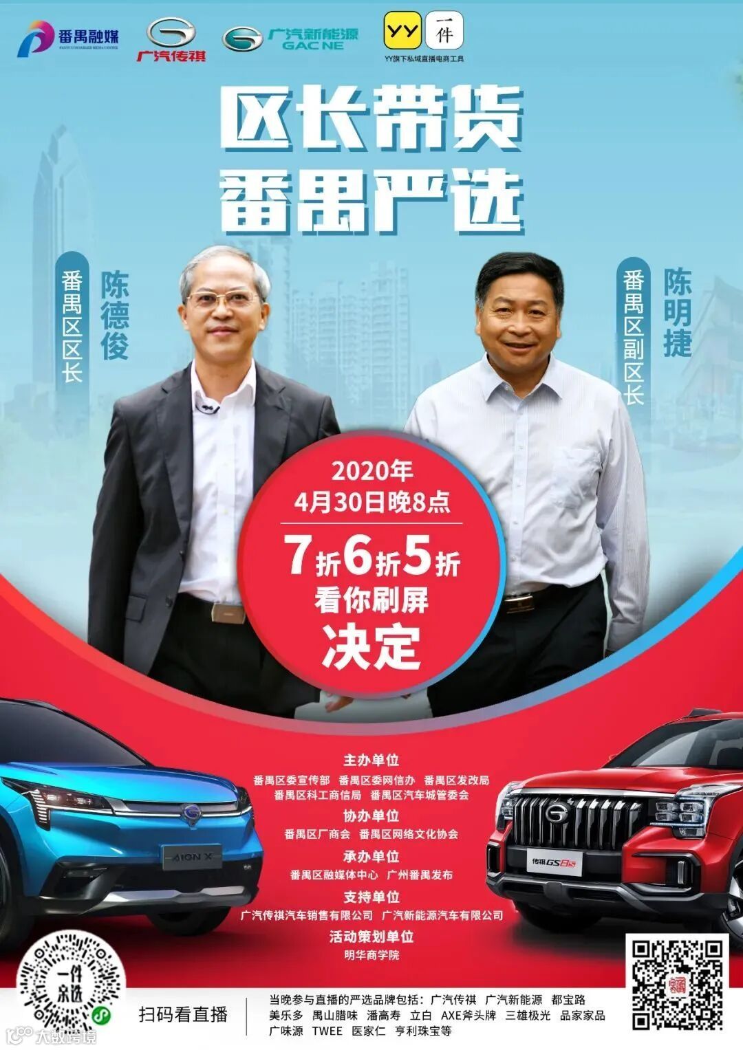 当晚直播间,车评人将对广汽传祺主推车型GS4和广汽新能源主推车型埃安LX进行测评,区长陈德俊和副区长陈明捷将作重点推介。