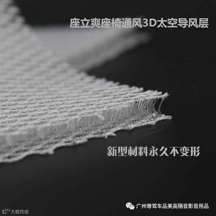 这个是3D太空导风网层,风扇吹出来的风,如果前面没有空间,那风也是吹不出来的。所以这层材料很重要,通过内部立体不规则的导风口,把风扩散至座椅表面,这样才能大面积的散热。