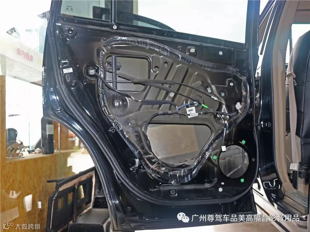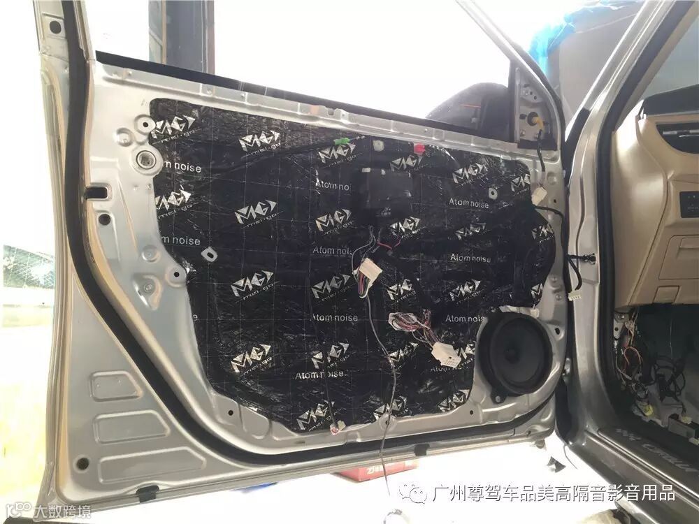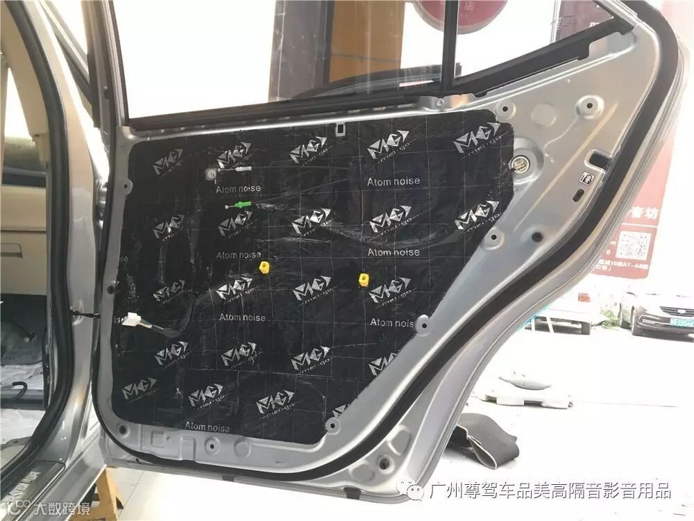 在车门内层钣金上粘贴美高隔音止震材料,也就是第一层隔音,它能增加钣金厚实度,减少钣金震动产生共振低频噪音源。