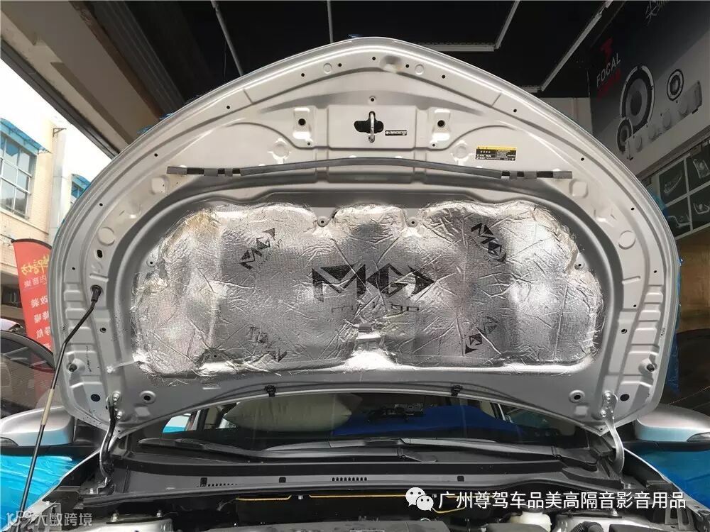 使用美高隔音止震材料对引擎盖内层钣金进行隔音处理,可以减少发动机噪声的传递和机盖的震动,使车内发动机噪声更加柔顺。
